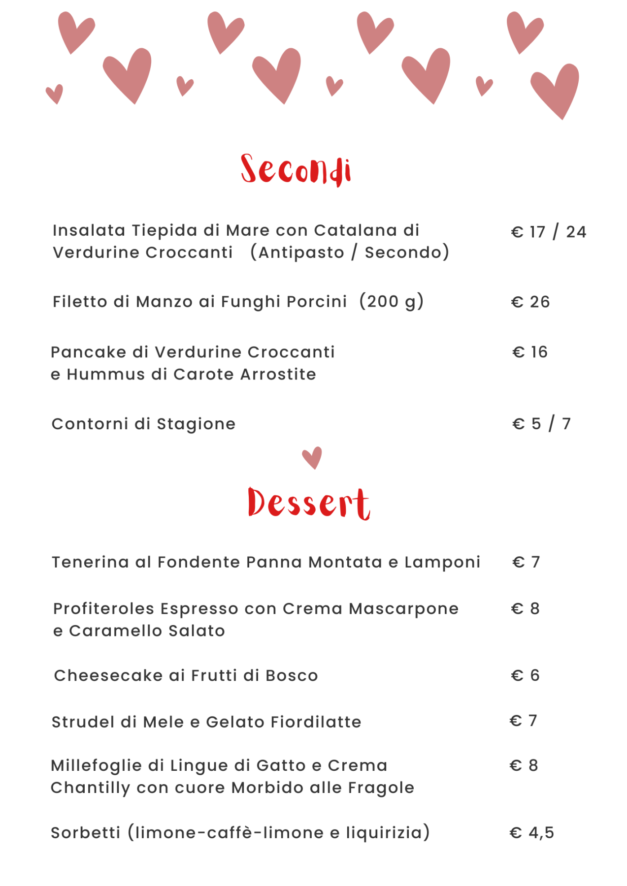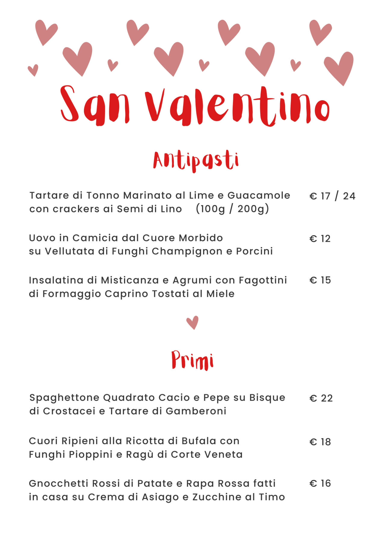 Si informa la gentile clientela che la serata di Venerdi 14 Febbraio, San Valentino, verrà gestita con il seguente menù alla carta dedicato.