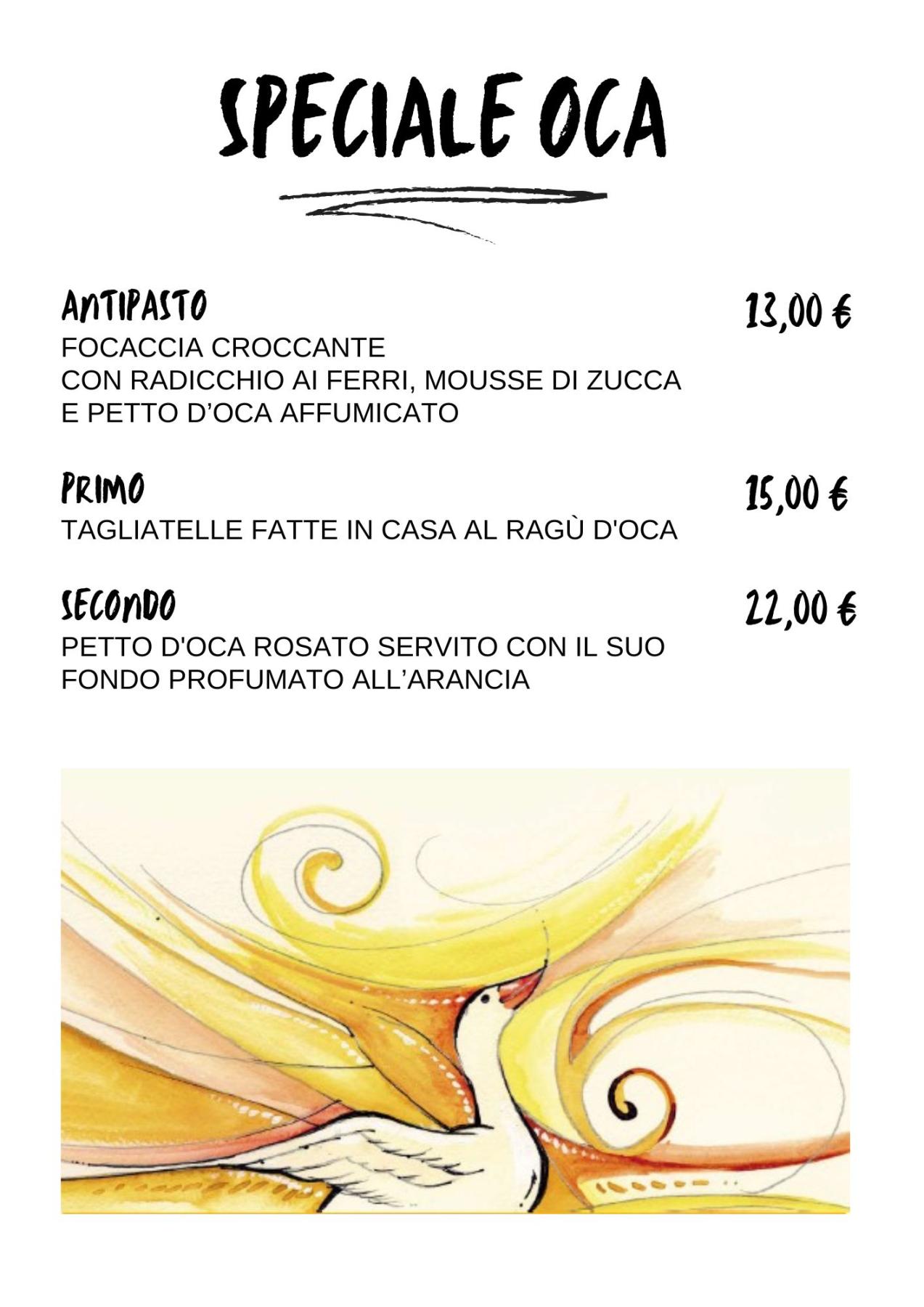 Come da tradizione, anche quest'anno per il mese di Novembre troverete 3 piatti dedicati all'Oca da poter scegliere alla carta.